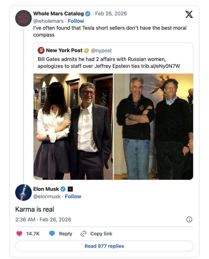 事情的缘由是,2026年2月26日,一位X用户援用《纽约时报》对于比尔·盖茨承认婚外情的报谈,并写谈:“我常常发现,特斯拉的作念空者零落细腻的谈德准则。”