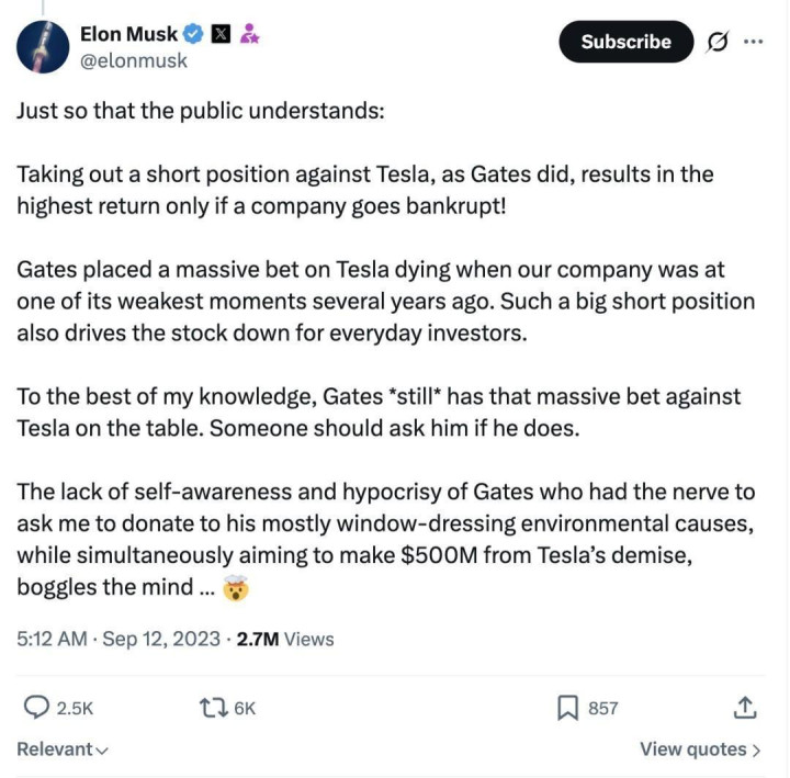 2023年9月,马斯克曾说:“像盖茨那样作念空特斯拉,只须在公司停业的情况下才能得到最高汇报……几年前,在咱们公司最穷困的时期之一,盖茨却押注特斯拉会倒闭。如斯繁多的空头头寸也会拉低常常投资者的股价。”