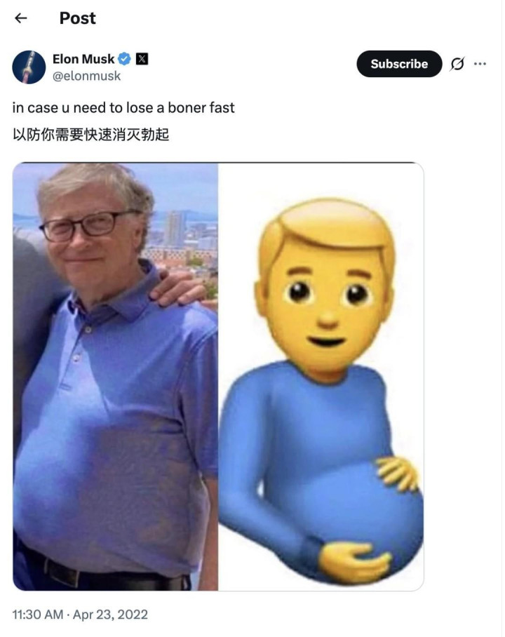 这既暗讽了盖茨的私生存争议,也将他与马斯克的买卖恩仇议论在了一谈——两天前,盖茨刚刚就我方的过往行动作念出了荒漠且详备的公开说明。