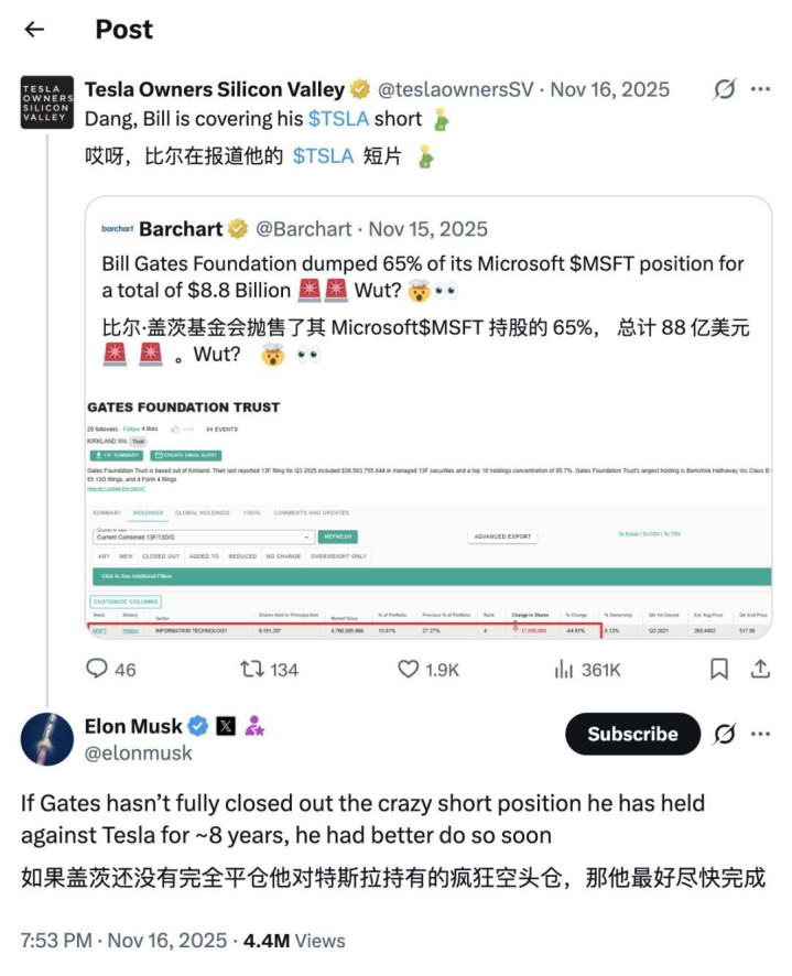 2025年12月,马斯克往事重提,称盖茨可能已经因作念空特斯拉损失100亿好意思元。