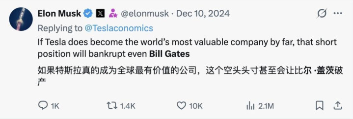 他在X上发帖称:“若是特斯拉真的成为专家最有价值的公司,这个作念空头寸以至会让比尔·盖茨停业。”