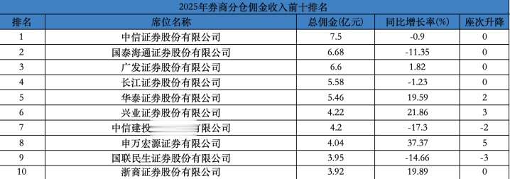 另需关切的是,前十阵营中,中信建投、国联民生证券的排位均有下滑。其中,中信建投2025年分仓佣金收入约4.2亿元,同比下降17.3%,排名从第5跌至第7。